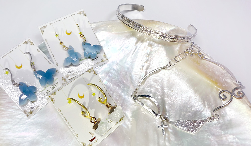 バイカラームーンストーン耳飾り ¥2,800 / ネックレス ¥2,100