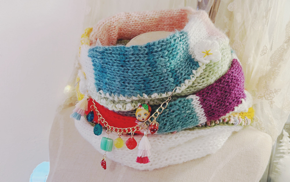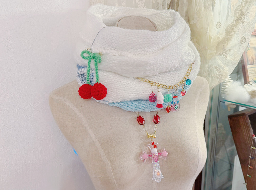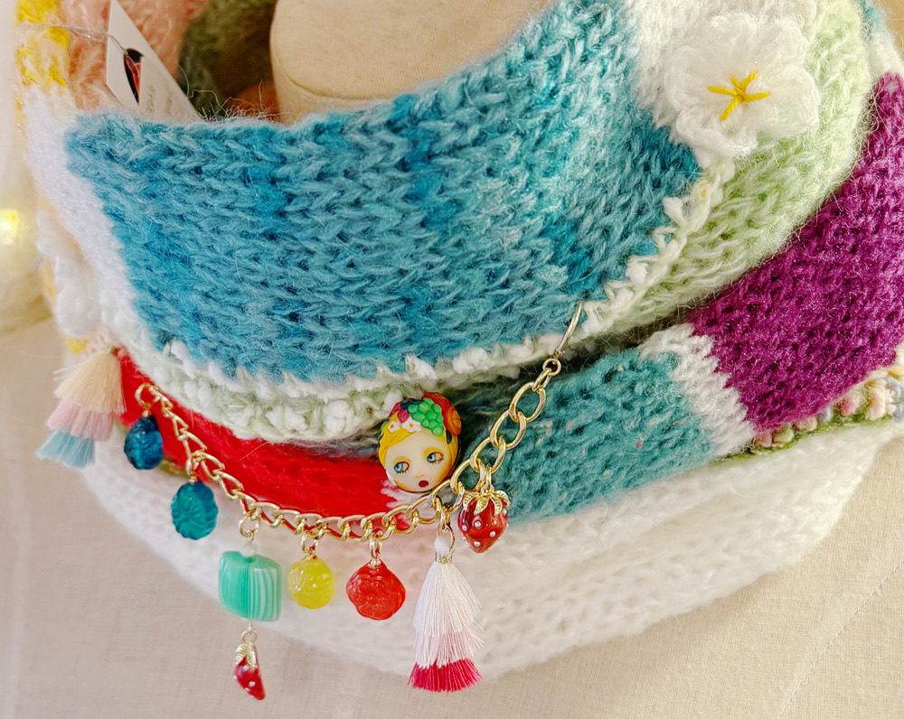 フルーツパーティの少女が大好きないちご、りんご、マスカット、オレンジ、ブルーベリー…あまずっぱい果物をぎゅっと集めたよう♪いちごの白い花も咲いています。(タビオトモ:スヌードに乗っている子です/展示品)