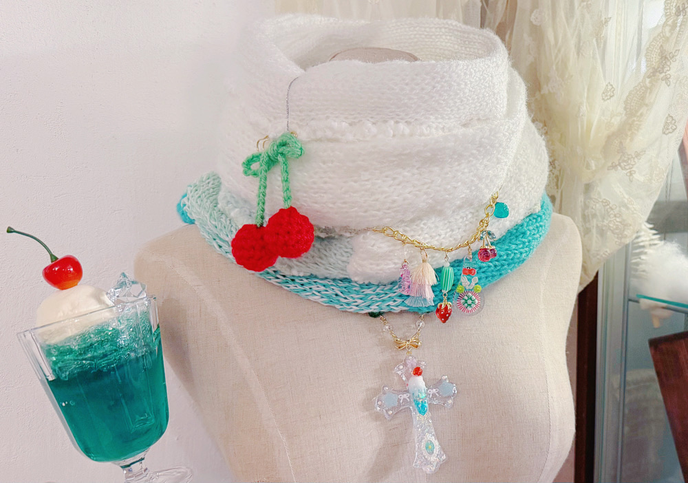 アイスクリームの白としゅわしゅわソーダのブルーグリーンに、手編みのさくらんぼをトッピング🍒