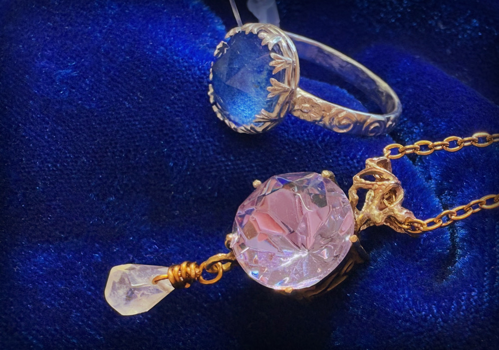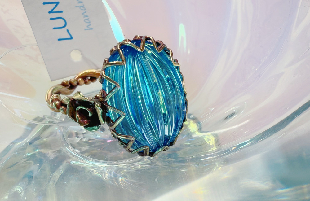 空色のソーダ水みたいなドイツ製ビンテージガラスの指輪。左右に薔薇も咲きました。