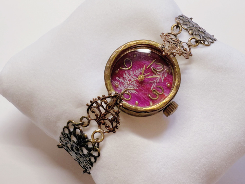 今回、深い紅と可憐な白が映える文字盤に、真鍮の透かしも浪漫ある時計が登場です。¥23,800