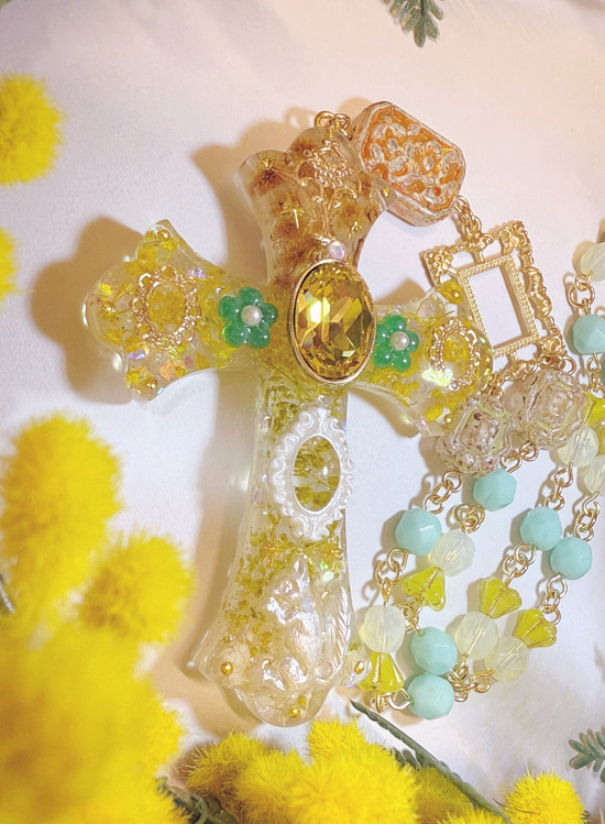 ぽわぽわの黄色いお花ミモザがたまらなくかわいい…!パール調なリスちゃんにもご注目です。¥8,000