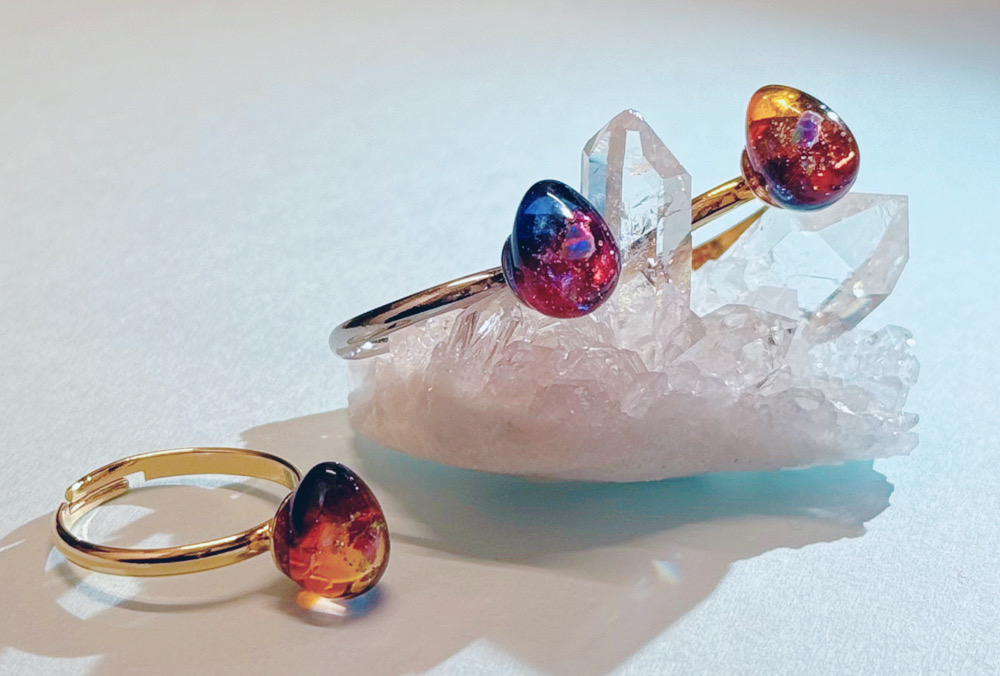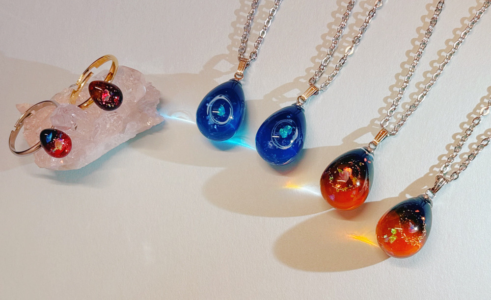 ご参考着画。青色は爽やかな気分になれる宇宙たまごです。(中央で輝くのは人工オパール✨)