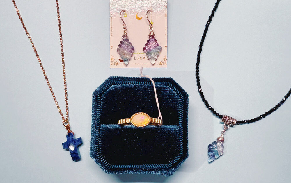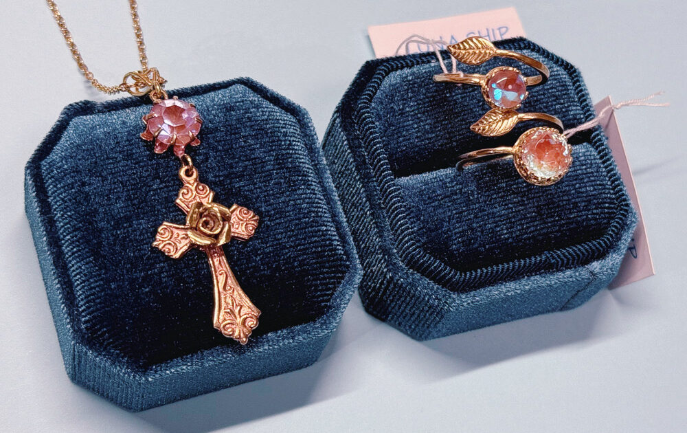 きらきらラベンダー色や青色浮かぶ、貴重な古硝子サフィリーンのネックレス・指輪。心をつかまれる色合いを間近でじっくり、ご試着もぜひどうぞ✨左:サフィリーン 薔薇クロスネックレス くるりと巻きつく葉っぱに、ぷる […]